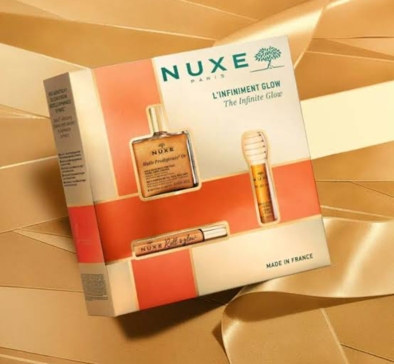 L’image montre le Coffret Nuxe L’Infiniment Glow, un ensemble de soins pour le visage, le corps et les lèvres.Â